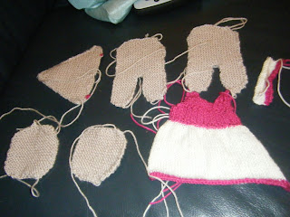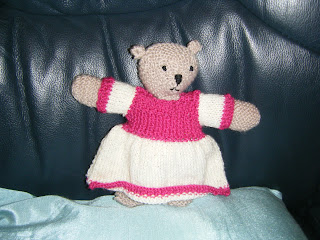 I spent most of the week (after work of course) knitting this little teddy. The pattern came from Crafts Beautiful magazine but I don't think she quite turned out as expected... the face is a little odd!!