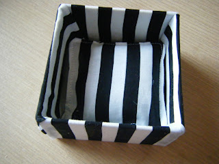 I covered a little box with the fabric and put a little cushion inside to hide the mess in the bottom, this is to hold the drawing pins I covered for him.