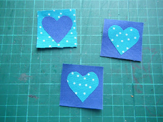 Sew a back stitch around the edge of the heart in a contrasting colour. I did the blue heart in aqua with it's aqua square stitched in blue, I did the aqua hearts stitched in blue with their blue backgrounds stitched in aqua.