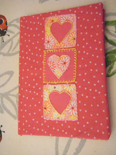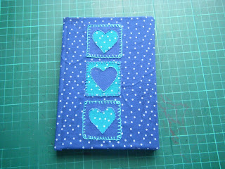 Having fallen in love with the idea of sewing, I wanted to put some of the fabric I'd bought to good use. I love notebooks and have loads of them lying around, so I decided to cover one with fabric and applique a design on to it. I used my blue spotty material again, and added some hearts which I embroidered onto. Here it is: