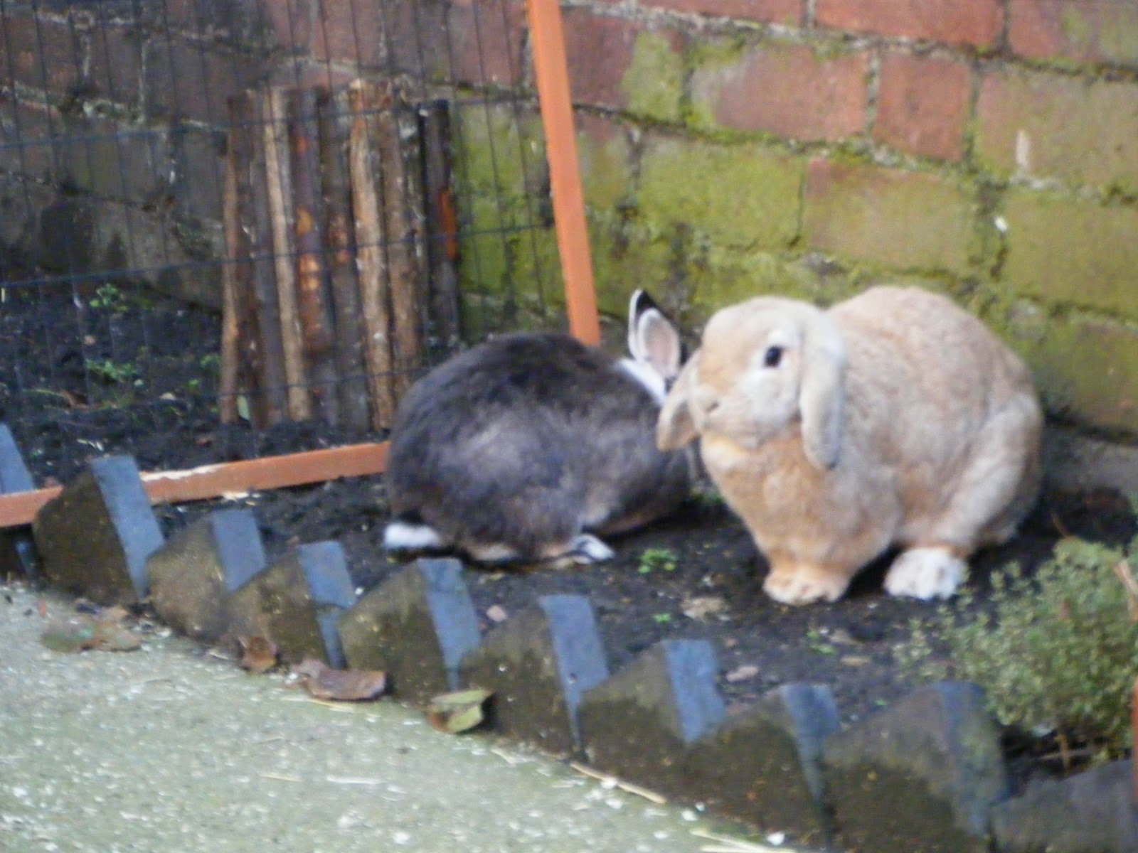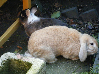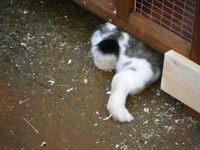 Here are Tiff and Harry during hutch cleaning operations. They spend the whole time I'm cleaning out trying to get back into, or under, their hutch, then when it's time to go in, they don't want to! I think Tiff's thinking about jumping over the make-shift fence here.