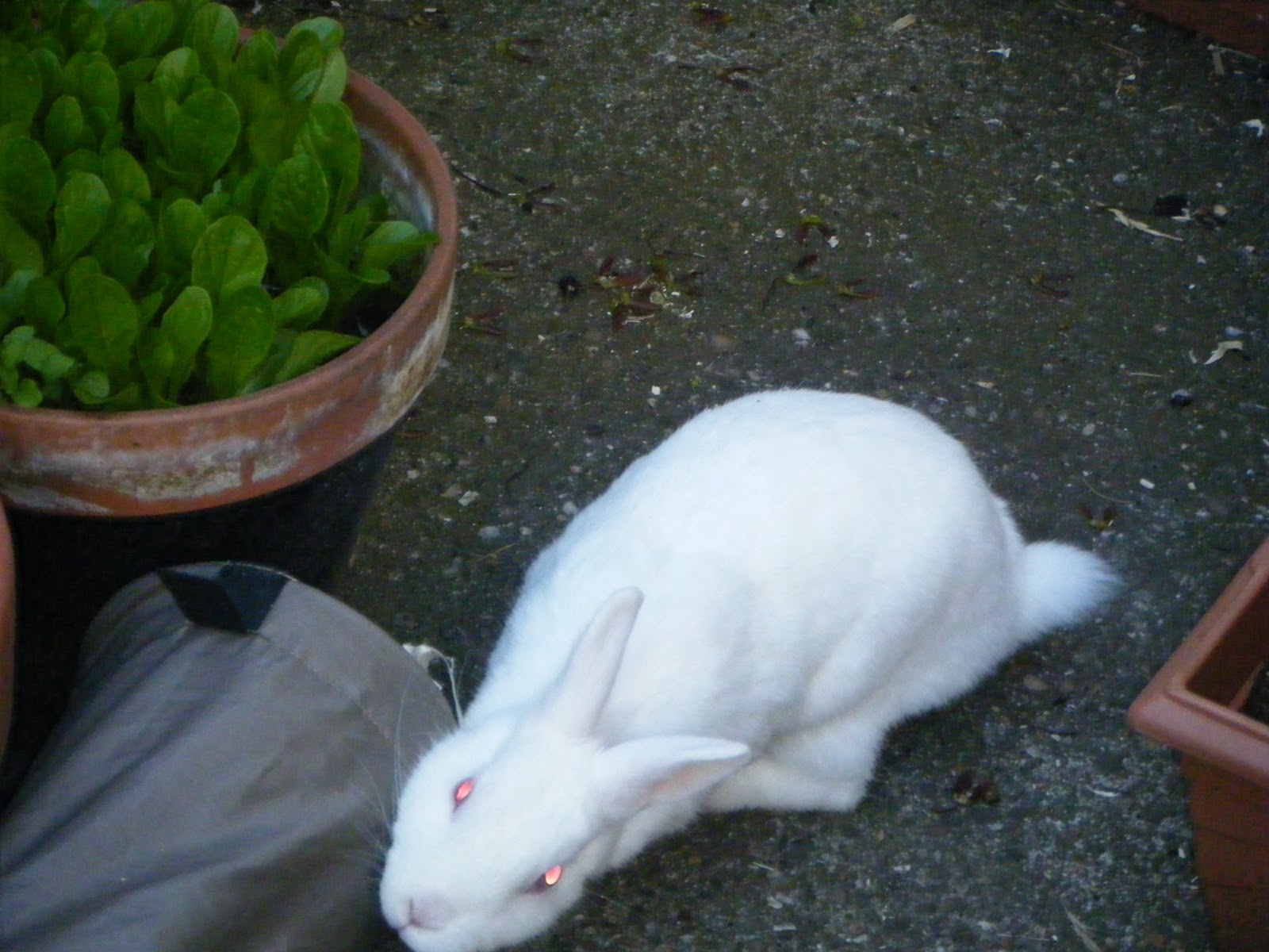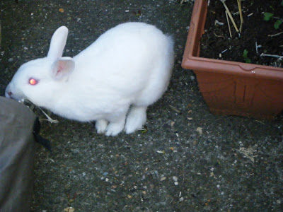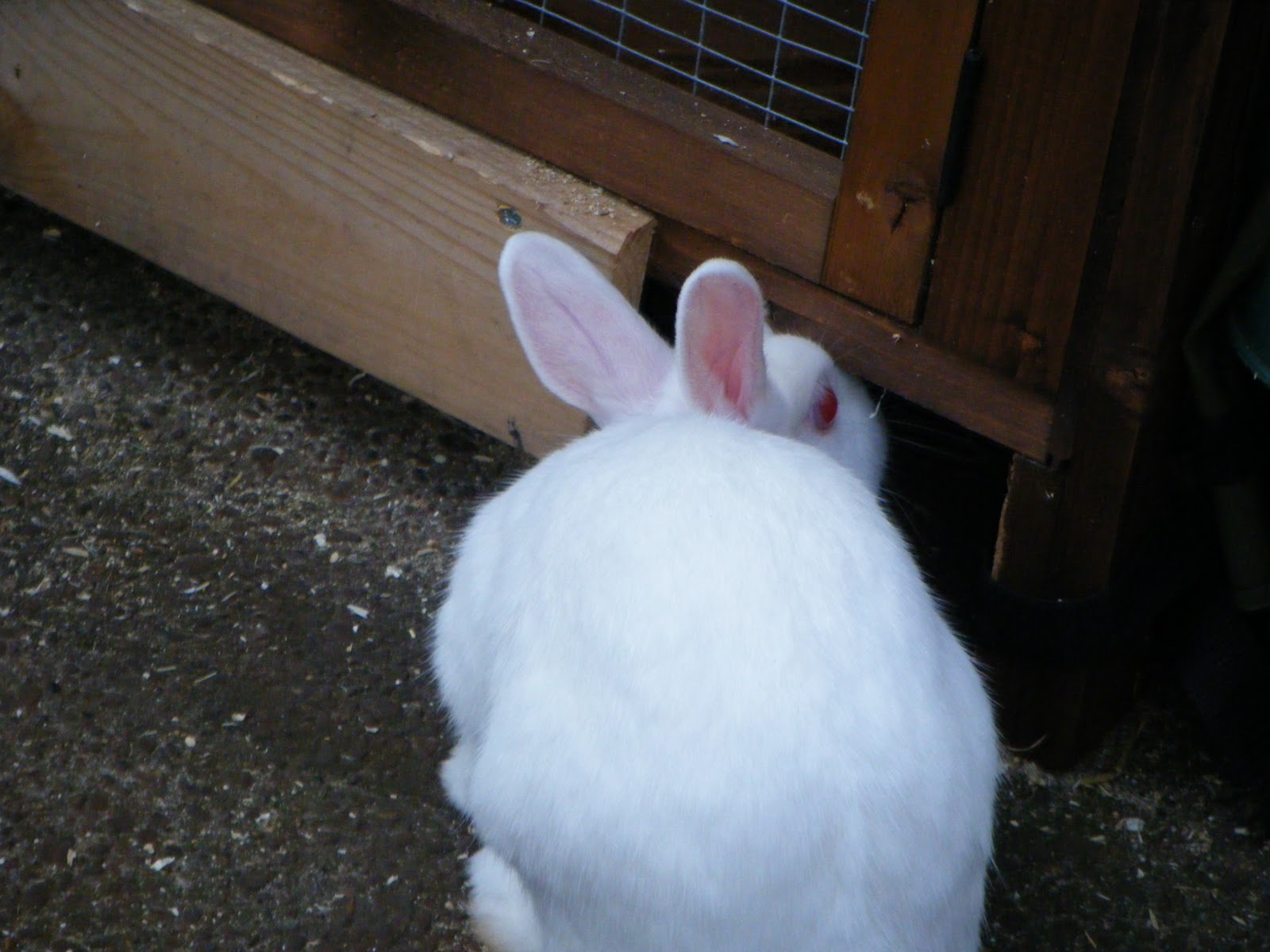This little angel is Ellis. Ellis doesn't photgraph well as the light shines off her pink eyes. She's an Albino Netherland Dwarf. She was badly treated before she came to live with us. She was skin and bones but is now a healthy weight. She was also terrified of everyone. Now she's still scared of most people, but I'm allowed to stroke her. Unless she's recently been to the vet for her jabs!